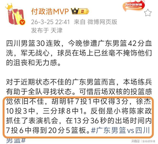 赛后,媒体人付政浩MVP社媒发文,除了对胡明轩、徐杰的表现进行了点评,对陈家政给予了高度评价:对于近期状态不佳的广东男篮而言,本场练兵有助于全队寻找状态。可惜后场双核的投篮感觉依旧不佳,7投1中仅得3分,徐杰10投3中,三分球8中1。反倒是小将陈家政抓住了表演机会,在13分36秒的出场时间内,7投6中得到20分5篮板。